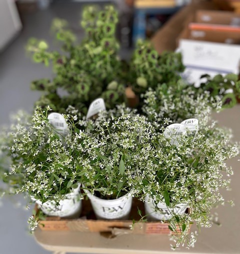 white mum planted in plastic pot with volunteer Diamond Frost